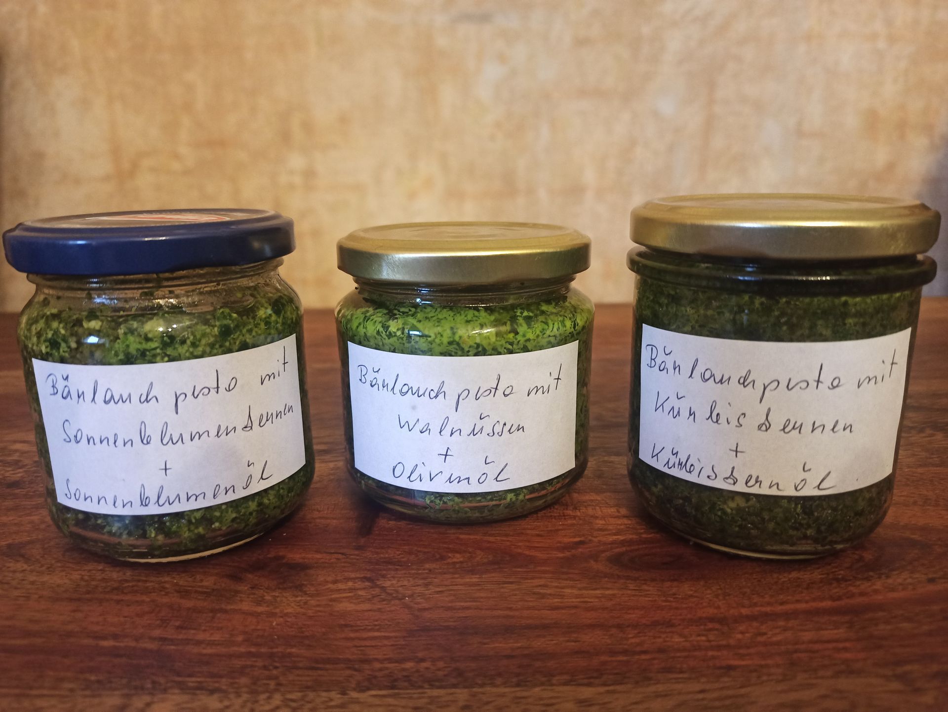 Aus dem übrigen Bärlauch hab ich dreierlei Sorte Bärlauchpesto gezaubert. eines mit Walnüssen und Olivenöl, eines mit Sonnenblumenkernen und Sonnenblumenöl und eines mit Kürbiskernen und Kürbiskernöl. Glücklicherweise muss ich mich nicht für eines entscheiden- ich find sie alle auf ihre Art schmackhaft.